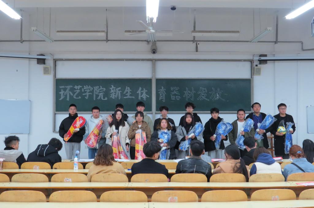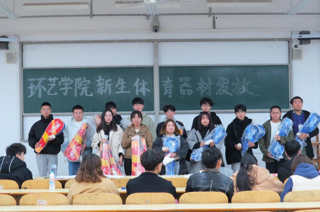 为活跃学生的课余文化生活,12月4日,环艺学院在1101教室为2019级新生各行政班级统一发放体育用品。环艺学院团总支书记朱函兵老师为2019级20个班级统一配发羽毛球拍、篮球、足球等体育用品50余件,并鼓励同学们加强锻炼,增强身体素质,各班班长纷纷表示一定将学院对学生的关心传递给每一位同学,自觉加强锻炼,丰富班级的课余文化生活。