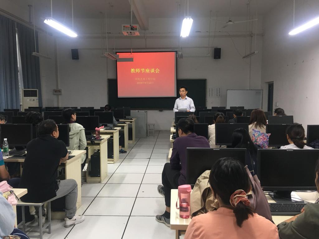为庆祝教师节,进一步提高教师师德水平和业务水平,环境艺术工程学院于9月12日下午在电教楼109教室开展了教师节座谈会。会上,王永书记传达了上级文件精神,结合自身体会和环艺实际,分享作为教师的自豪感和使命感,勉励广大教师加强学习、提高认识,发扬实事求是精神,团结协作,以饱满的热情投入到工作生活中,同时学院尽可能为教师发展创造条件。接着,陆立颖院长、司志国副院长、李倩副院长分别分享了自己进校以来工作上的教育教学体会和心得,从不同的角度发表了看法,同时还对面临的思想困惑谈了自己的想法,并对学校教育事业的发展提出了一些积极的建议。参会教师一致表示要不断扩大自己的知识面,加强以德树人及专业化教育。最后在领誓人李宁老师的带领下,全体教师高举右手,庄严宣誓。(供稿:贾方晶审稿:王永)