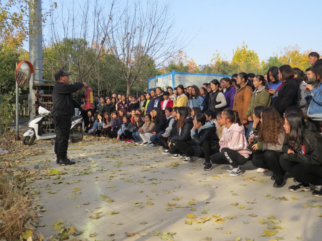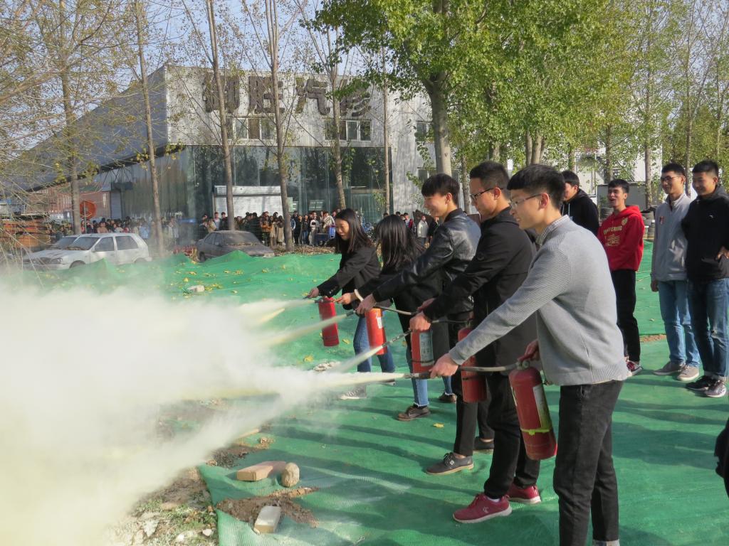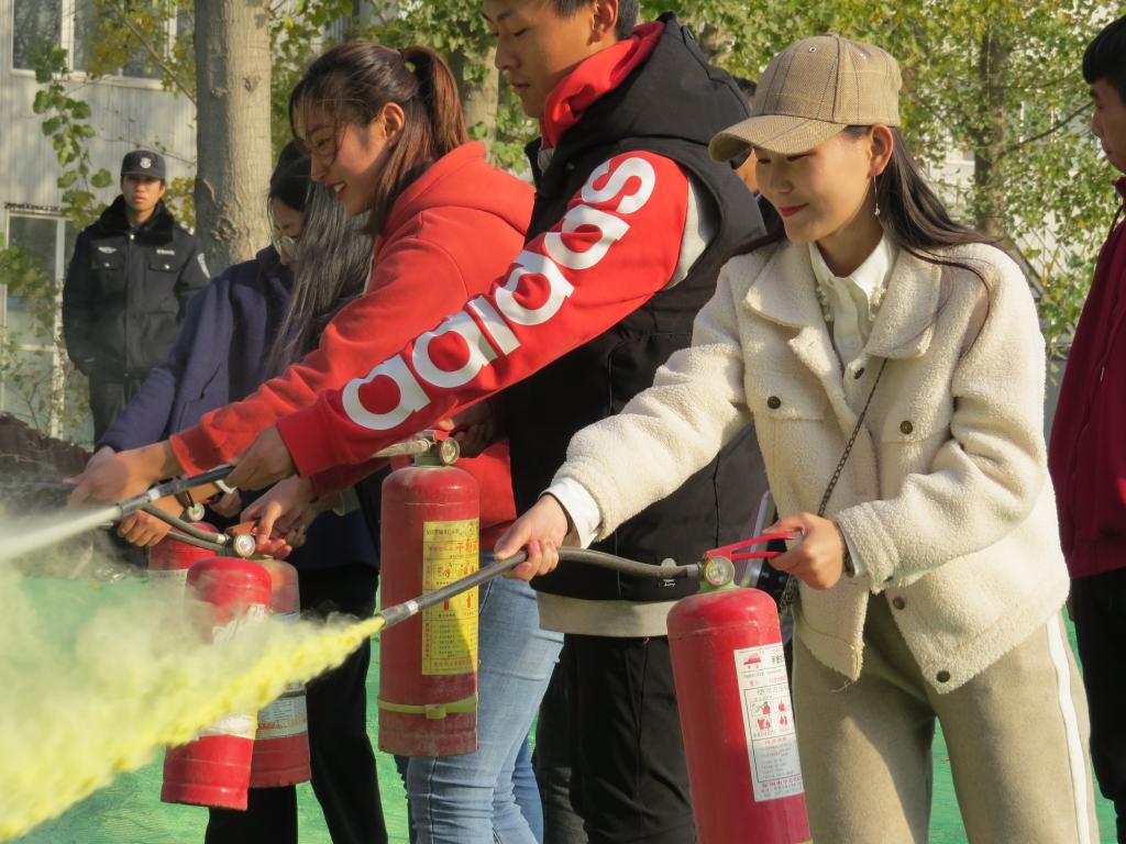 演练现场,保卫处人员向同学们详细讲解了突发火灾的处理办法、干粉灭火器的操作步骤及方法,并开展了灭火器实操演练。
