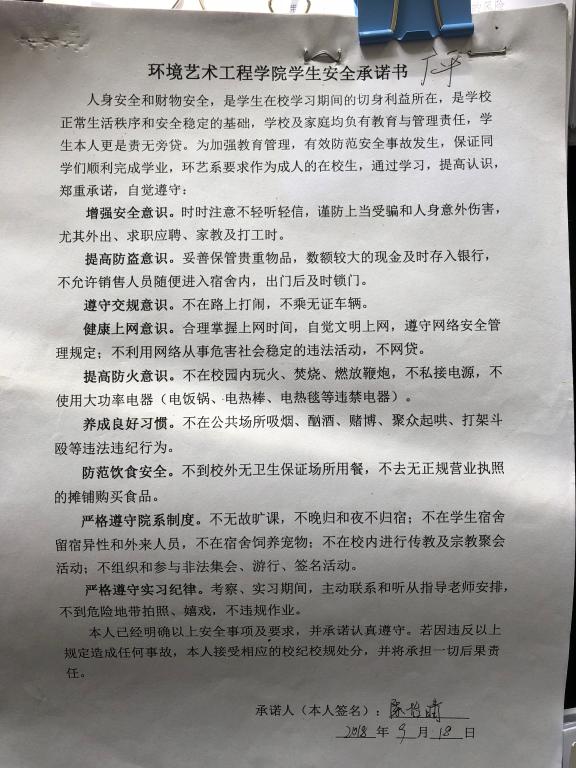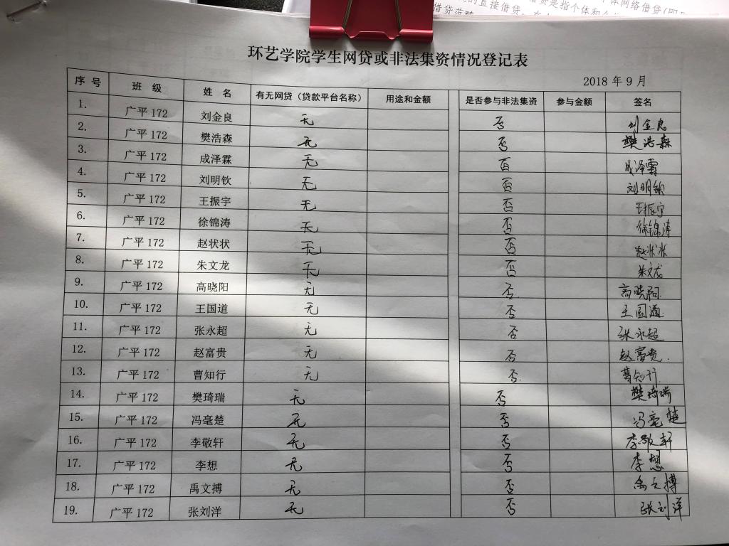 为保障环艺学院2018级新生安全、健康开始大学生活,近期,环艺学院通过主题班会等多种形式在2018级新生中开展网贷风险教育、人身财产安全教育、奖助学金正确使用等系列教育活动,让学生充分认知、正确防范大学生活中的各类安全隐患。系列教育活动中,环艺学院还对学生网贷情况进行全面摸底,形成网贷情况登记表留存备案;并组织全员学生填写完成助学金告知书、网贷风险告知书、大一签安全承诺书。(供稿:胡勇,审稿:王静)
