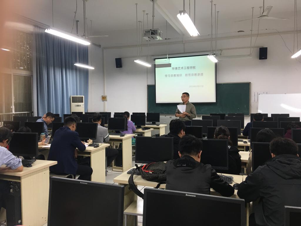 根据我校《关于做好师生宗教知识学习工作的通知》、《中共河南职业技术学院委员会关于进一步做好校园防范宗教渗透工作的通知》,我院于2018年9月27日下午在电教楼109召开全体教工专题学习会议,引导教师树立马克思主义民族宗教观、了解掌握党的民族宗教政策和国家有关法律法规,部署本部门防范宗教渗透具体工作安排,及时正确处理涉及民族宗教等方面的问题,防止宗教特别是邪教在学校的渗透,确保环艺学院的安全稳定。
