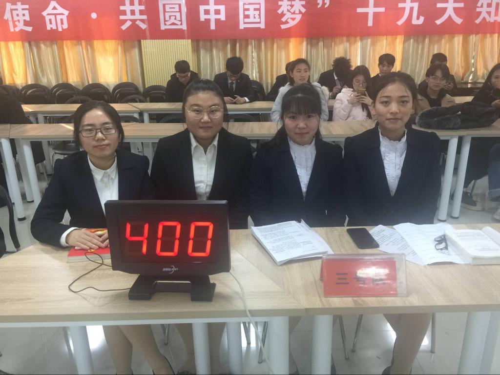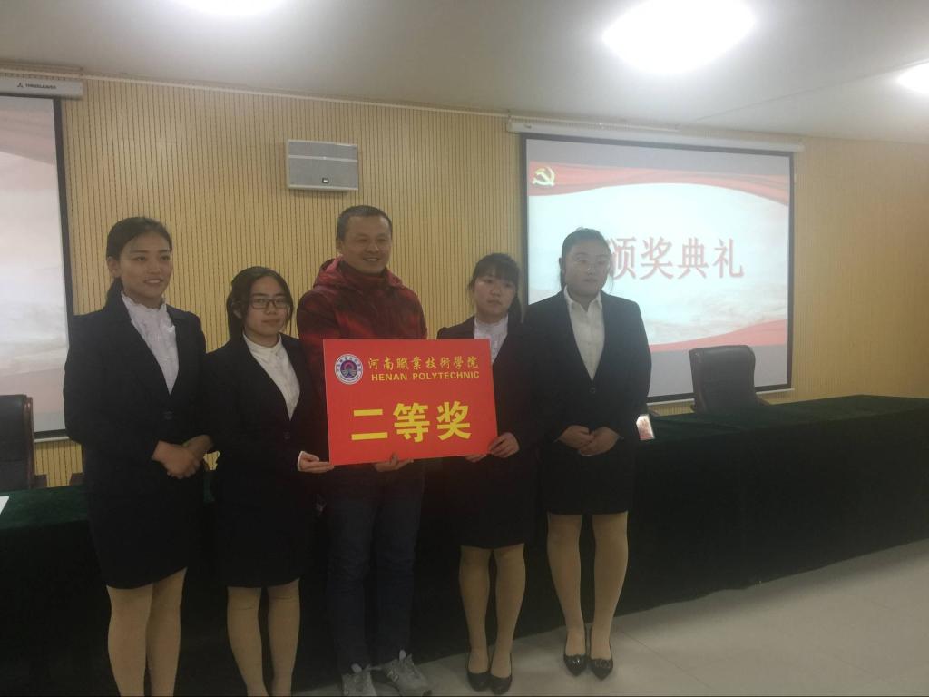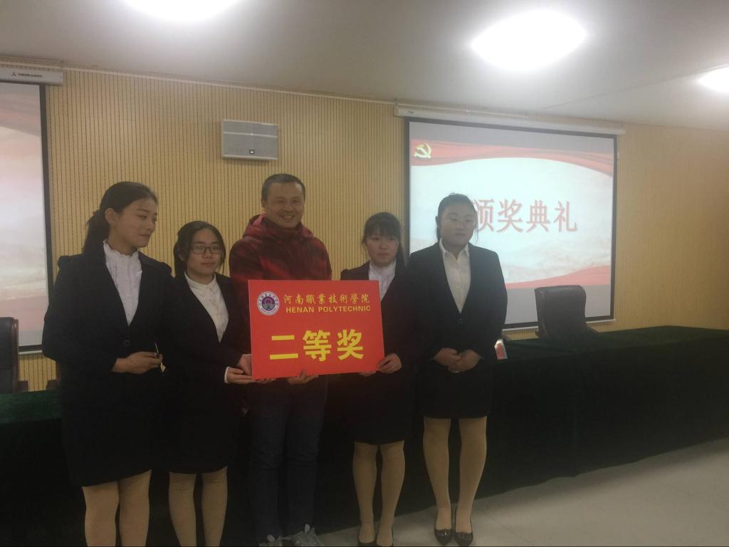 1月11日下午,河南职业技术学院“不忘初心,牢记使命,共筑中国梦”十九大知识竞赛在院综合楼525举行,由朱函兵老师任领队、园工171班崔笑玲、边秋寒、黄思雨及工造 174班李佳欣四位学生组成的我系参赛队参加此次比赛,并以总分400分的成绩荣获二等奖! (供稿:胡勇,审稿:王静)