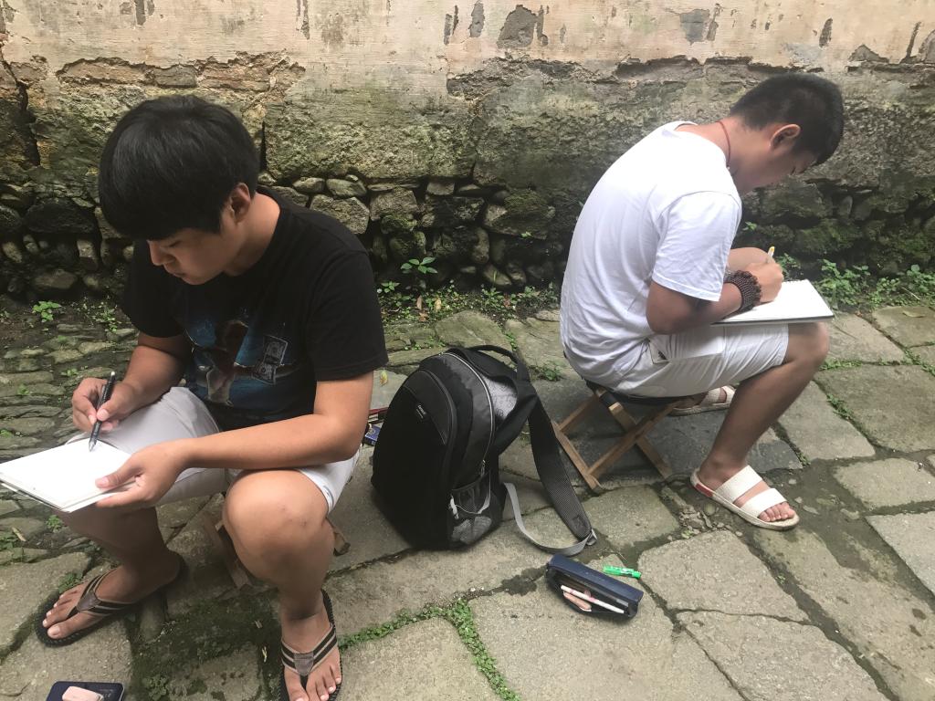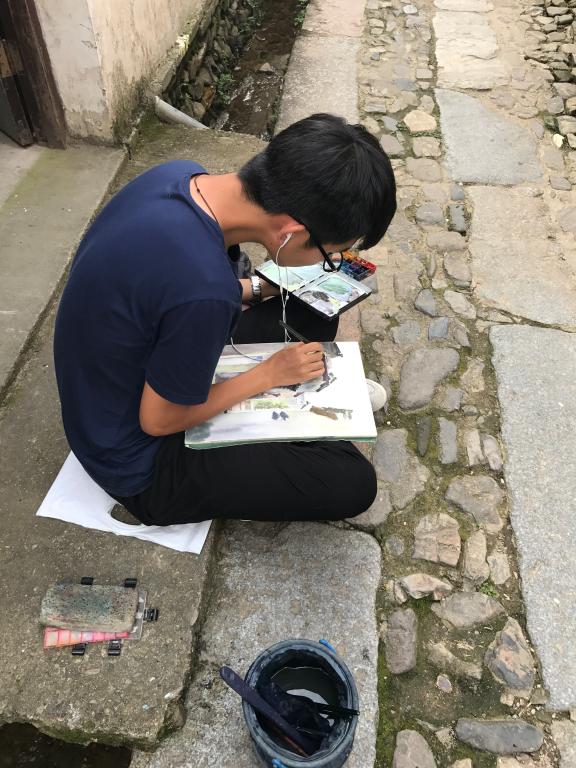 在这个被誉为人文景观,自然景观相得益彰的典型徽派建筑村落中,各位同学认真研究徽派建筑风格,从徽派建筑的马头墙、灰白屋壁中感知地域风貌,从精美的木雕、石雕、砖雕作品中感知历史魅力。全体师生不辞劳苦,克服湿热梅雨天气的干扰,白天认真搜集素材,对景写生,绘画创作,体会徽派文化的精髓,晚上分组讨论,评讲交流学习心得。
