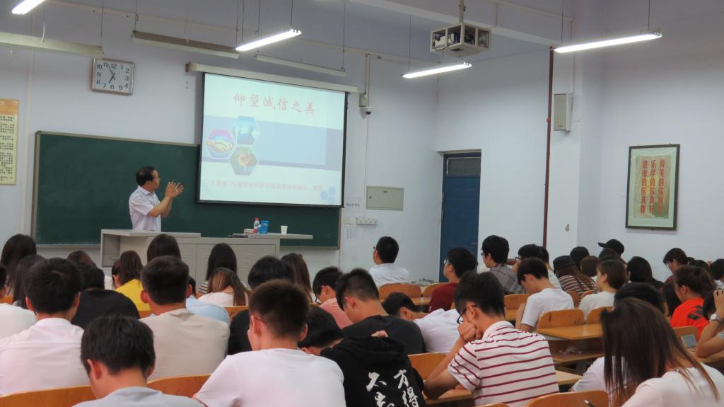 讲座中,河南牧业经济学院党委宣传部部长王凌彬教授为学生做了主题为“仰望诚信之美”的演讲。王教授围绕诚信的传统美,从礼仪、道德、基本社会行为规范等方面进行了论述。列举了曾参杀猪立信、商鞅立木取信等大家耳熟能详的例子。他提出:“诚是信之根,信是诚之用”,告诫大学生在生活中要做到:诚实守信、诚实劳动、恪守承诺、诚实待人。
