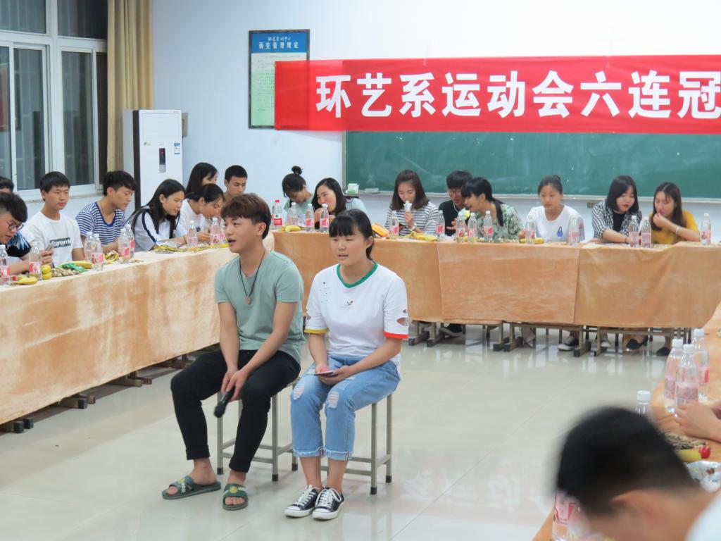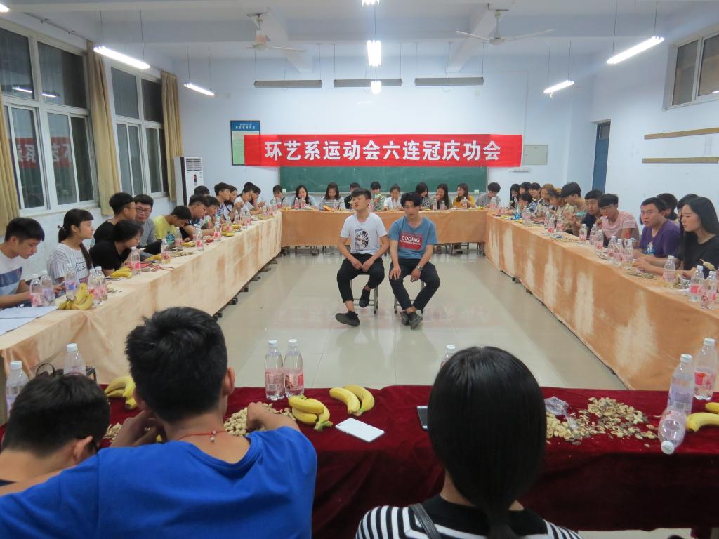 本届田径运动会中,在环艺系全体运动员和学生的共同努力下,取得了喜人的成绩,以总分331的优异成绩获得学院田径运动会团体总分第一名,荣膺院田径运动会团体总分六连冠。系学生会经过多天的紧张策划、彩排,组织了本次庆功会,向全体运动员们献上了一份“精神大餐”,以此向所有的运动员们表示感谢。