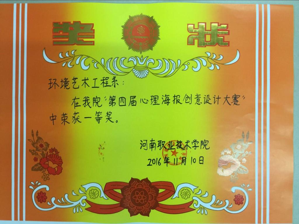 10月8日至11月1日,在我院举办的“第十届大学生心理健康教育宣传周”活动中,环艺系积极参与,并在思政部心理咨询中心联合院团委举办了学院第四届 “不忘初心,成就自我主题心理海报创意设计大赛”中荣获一等奖。 (供稿:李青云 审稿:王静)
