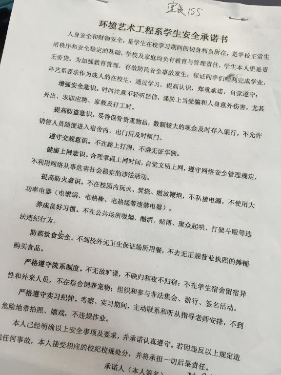 为提高学生安全意识,杜绝安全隐患,普及安全知识,2016年3月中上旬,环艺系在两周的时间里,通过各种方式对学生进行安全教育。 在安全教育工作中,辅导员老师通过主题班会为同学们讲解安全知识,通过走访、检查宿舍督促学生杜绝宿舍安全隐患,通过组织学生代表参加学院安全教育讲座提升学生的安全观念,通过和同学们签署安全承诺书强化学生的安全意识。 通过两周的安全教育活动,环艺系学生安全意识和安全观念得到了有效的提升,取得了预期的效果!