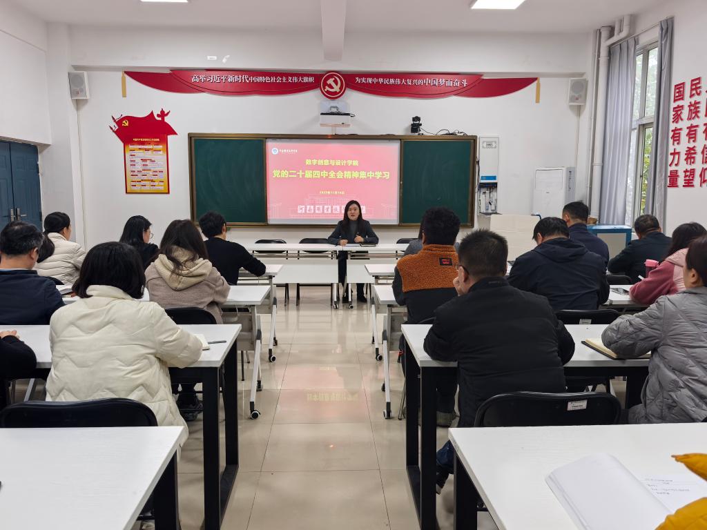 为深入贯彻落实学校关于学习宣传党的二十届四中全会精神的工作部署,11月6日下午,数字创意与设计学院在敏行楼党员活动室召开全体教师会议,党总支书记兼院长徐海燕主持会议,传达并领学党的二十届四中全会精神。