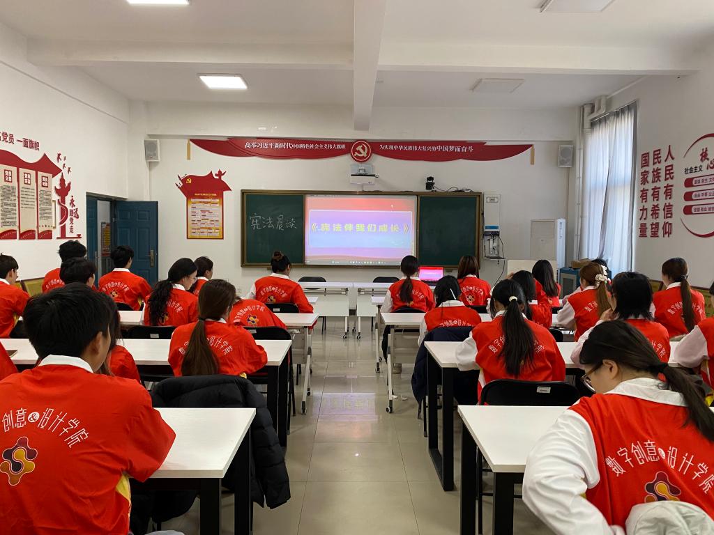 12月4日国家宪法日当天,学院组织师生代表通过网络直播同步收看了教育部全国教育系统“宪法晨读”活动。在庄严肃穆的氛围中,师生们齐声诵读宪法部分条款,字字铿锵,句句入心。在朗朗诵读声中,将尊崇宪法、学习宪法、遵守宪法、维护宪法、运用宪法的种子深植于青年学子心中,有效涵养了爱国情怀与法治精神。