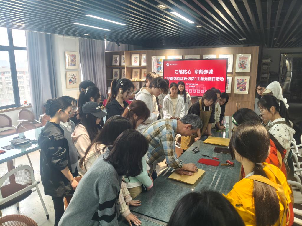 为传承红色基因,创新主题党团日活动形式,3月26日,数字创意与设计学院学生党支部在合鼎楼版画与印刷体验工作室,举办“刀笔铭心 印刻赤诚——非遗镌刻红色记忆”特色主题党团日活动。非遗技能大师郝彦杰受邀现场指导,学院党团员代表沉浸式参与木刻版画创作体验。