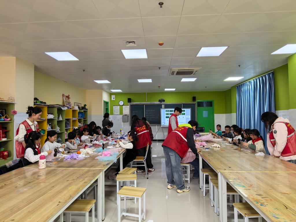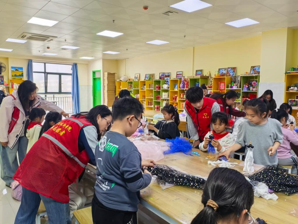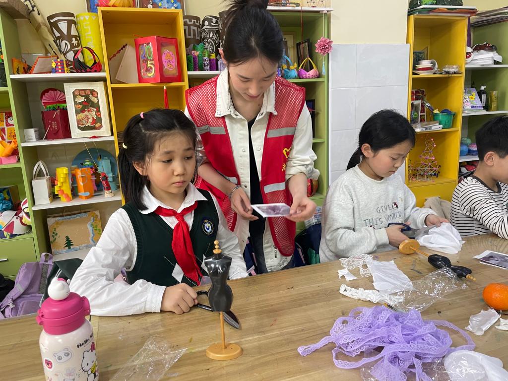 活动伊始,志愿者老师通过精美的图片和生动的故事,向孩子们介绍了服装设计的基本概念、美学元素及材质运用知识。随后,志愿者们发挥专业特长,引导孩子们观察不同布料、网纱的质感与光泽,理解材质与造型的关系,视觉表达的角度,启发孩子们大胆构思属于自己的创意服装,让想象与设计碰撞出奇妙火花。在志愿者“一对一”的辅导下,小设计师们兴致勃勃地在迷你人体模型上缠绕、粘贴、装饰,将天马行空的想象化为一件件充满童趣的立体作品。