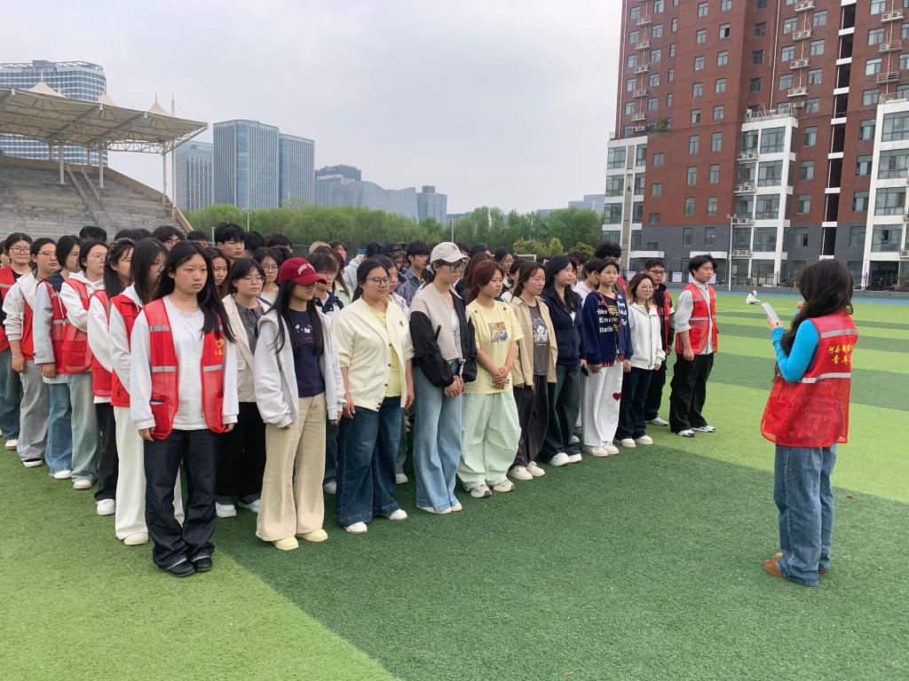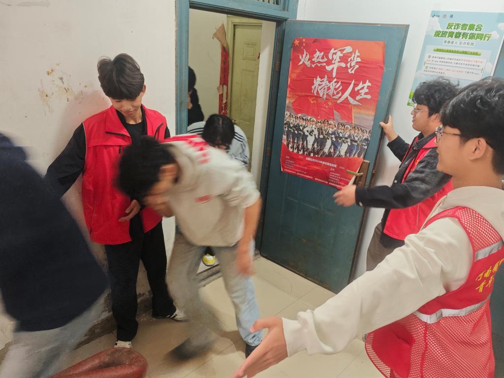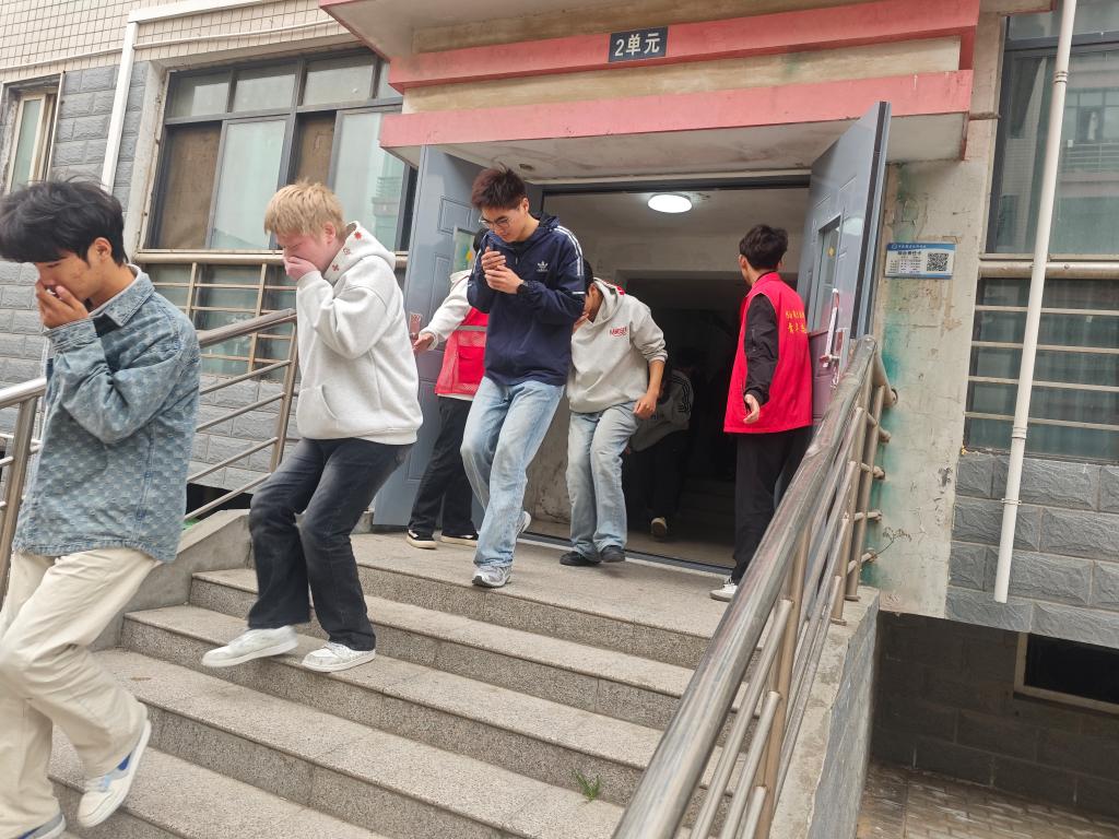 演练模拟突发火情场景,学院青年志愿者在各楼层、疏散通道关键点位引导,参演学生规范做好防护姿态,沿预定路线快速有序撤离,全体人员仅用时2分50秒安全疏散至指定集合区域,演练组织有序、流程高效。